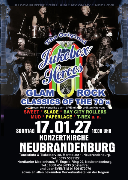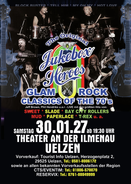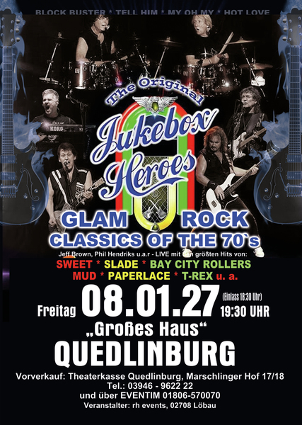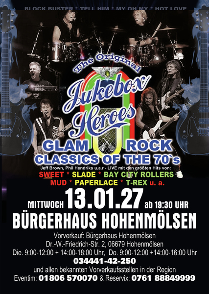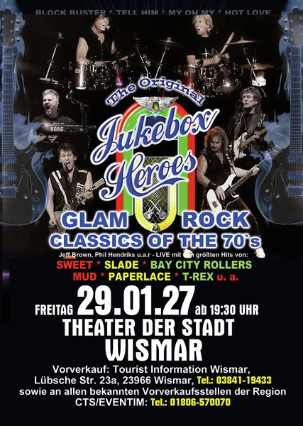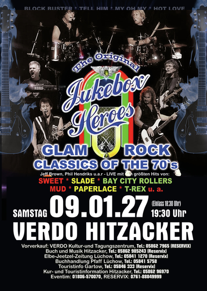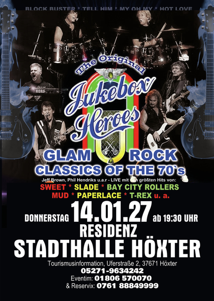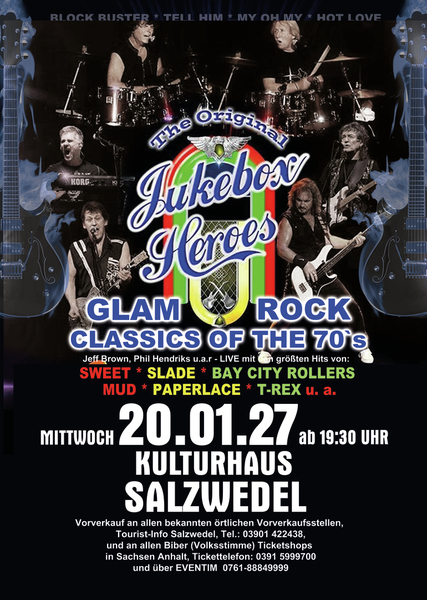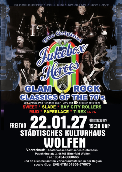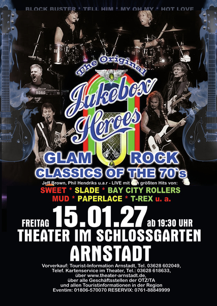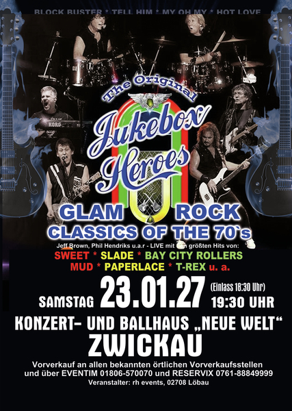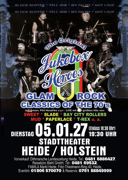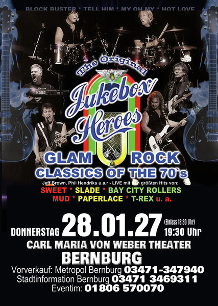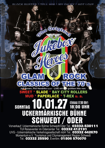 Erleben Sie songs wie” Ballroom Blitz“ und „ Fox on the run“ von der Band SWEET, „Coz I Luv You“ und „My Oh My“ von SLADE, „Bye Bye Baby“ on BAY CITY ROLLERS, “Angel Face” und „Come on” von der GLITTERBAND, „Chicago Night Died” und “Billy Don't Be A Hero” von PAPERLACE, “Get it on” und Hot Love” von T-REX.